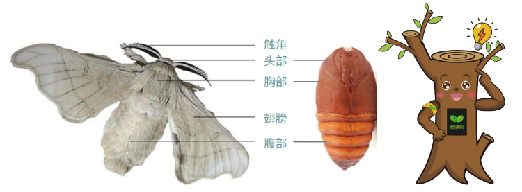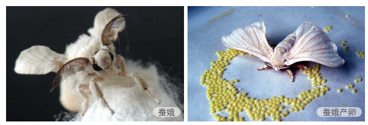 蚕蛾的成虫全身被白色鳞片和毛覆盖。头部小,复眼一对,触角羽毛状,口器退化,不能吃食物。胸部三对足,两对翅,由于人工长期饲养,飞行能力退化。蚕蛾口器退化,不能吃任何食物,它们生活所需要的养分和能量全靠幼虫时期的积累。