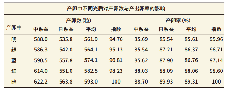 浙江农业大学桑蚕学系用明、红、绿、蓝、四种光质和暗区对桑蚕交配和产卵中做了处理,结果产卵数量暗>红>蓝>绿>明。从红、蓝、绿三种单色光来看,红光波长最长,蓝光其次,绿光最短,所以能得出结论桑蚕的产卵数量与光的光质无关,但是与光的强度有密切的关系。明区光照强度最高为 20lux, 产卵数最少,蚕蛾腹中存留卵多。暗区光照强度最低为 0lux,产卵最多,腹中存留卵少。