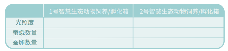 请小朋友们4人为一小组,A组小朋友把经过交尾的5只雌蚕蛾放入1号智慧生态动物饲养/孵化箱,将箱内光照度调节到到 25lux以上,B组小朋友把5只经过交尾的雌蚕蛾放入 2 号智慧生态动物饲养 / 孵化箱,将箱子用遮光布包起来,使光照度降至 0lux,然后观察雌蚕蛾的蚕卵情况并将它们记录下来。