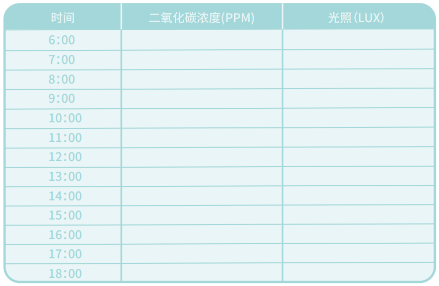 (1)请同学们根据“智慧生态教育学习平台”上显示的数据进行统计,记录一天中各个时间点的二氧化碳和光照数据,完成下表: