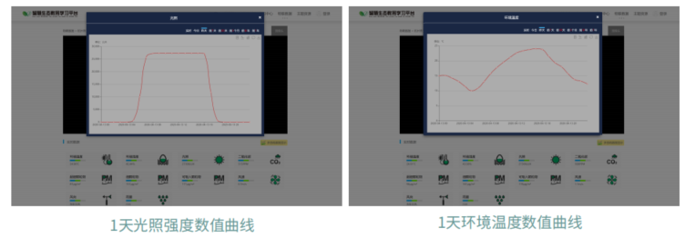 点击 “光照”和“环境温度”分别查看数据图中显示的就是学习平台上环境温度和光照的数据,它可以收集一天、一个月、三个月,甚至一年的数据,平台上还有环境湿度以及其它的一些数据的折线图,以便于同学们带着环境温度和光照关系的问题来进行学习,并对一天中的光照数据和环境温度进行统计,最后来得出自己想要的答案。