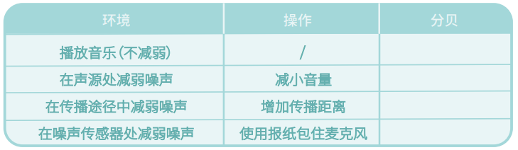 耳是我们的听觉器官,需要精心呵护。那么,怎样才能避免听力受到伤害呢?请小朋友使用噪声传感器模拟人耳,分别在声源处减弱噪声、在传播途径中减弱噪声、在噪声传感器处减弱噪声,并且记录下来,进行对比。