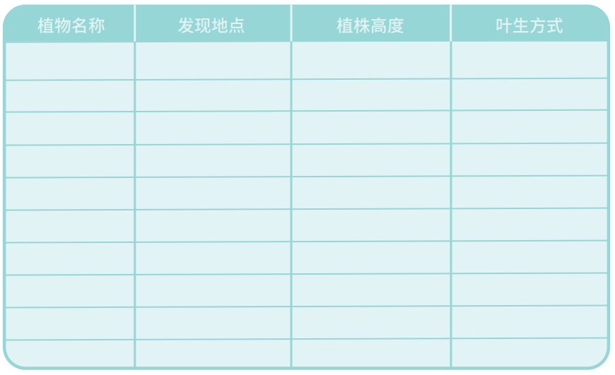 我们一起来发现校园中有哪些植物吧! 如果发现我们不认识的植物,别忘记了继续使用智慧生态教育APP的“植物识别”功能来进行扫描哟!将我们在校园中识别出来的植物记录下来吧: