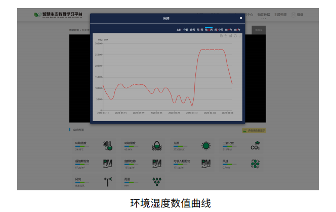 同时,同学们可以登录智慧生态教育学习APP或登陆智慧生态教育学习平台(http://www.wiseedu.cn) 进入“物联数据”二级页面,找到你想了解的学校相关的智慧生态气象微观察记录仪。学习平台上有着光照强度和环境温度的数据折线图,以供同学们参考和学习。