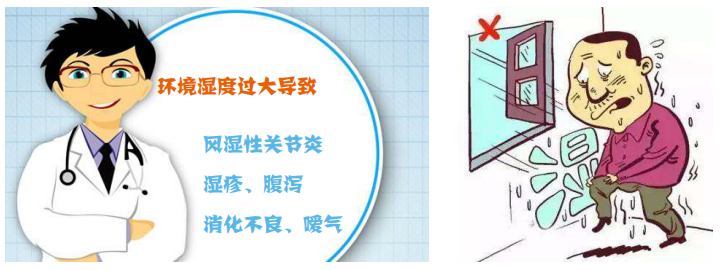 我们人类对生活环境湿度有很高要求。人长期处在空气湿度较大环境中,会感觉皮肤湿冷、出汗或者黏糊糊的。湿度太大时,人体中的松果激素量也会增多,使得体内甲状腺素及肾上腺素的浓度相对降低,人就会感到无精打采,萎靡不振。长时间在湿度较大的地方(如高山、海岛)工作、生活,还容易患风湿性、类风湿性关节炎等湿痹症。