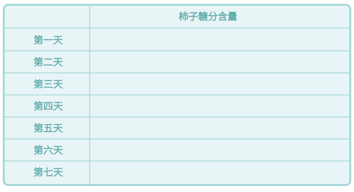 是不是很好奇,青涩的生柿子是怎么变成香甜软糯的熟柿子的呢?这些糖分是怎么悄悄出现的呢?我们来做一个实验吧,把树上摘下来的生柿子放到一个塑料泡沫箱里,然后再把同等数量的苹果也放进这个塑料泡沫箱,最后盖上盖子,形成密闭环境。接着,我们每天拿出一个柿子,切一小块,挤出果汁,用“高精度糖分检测仪”测量柿子的糖分含量,然后记录在下表。