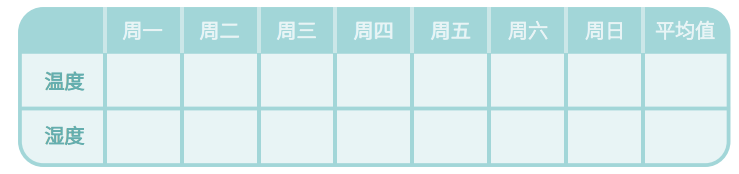 请小朋友们用“气象微观察记录仪”调查你学校空气温湿度一周 7 天内的变化情况,并得出平均值,把收集到的信息填入表格。