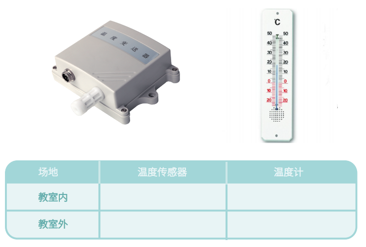 温度传感器和温度计都能够测量温度,那么它们的区别在哪里呢?请同学们使用温度传感器和温度计两种温度测量工具,分别在教室内和教室外测量温度数据,记录下来,并进行对比。