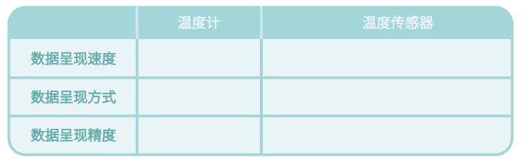 通过两种测量工具的比较,我们可以发现利用传感器和利用温度计测量温度有很多的区别。我们填写下面这张表,来对比它们的优缺点吧。