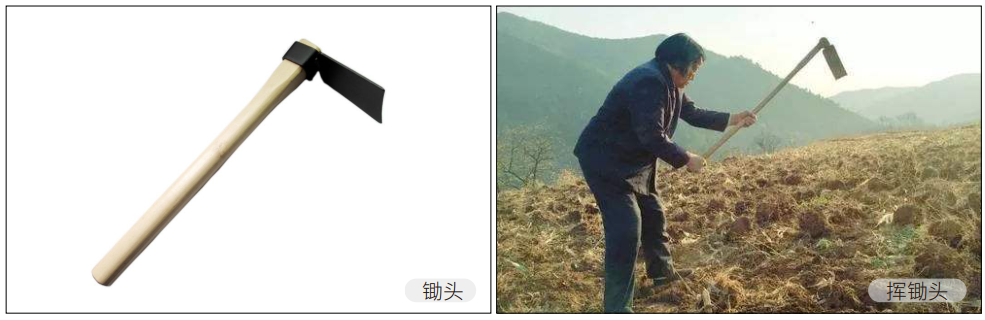 然后就是挥锄动作,根据要刨开土的深度适当抬高,前手用力下压,后手紧紧持住锄把尾部并随锄头发力情况抬起,两只手要注意配合同步运行。