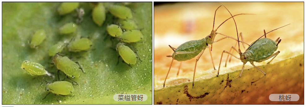 青菜的蚜虫有菜缢管蚜(萝卜蚜)和桃蚜两种,它们是青菜的主要害虫。这两种菜蚜的成蚜和若蚜,均吸食菜汁,使叶片卷缩发黄,植株矮化,且能传播病毒病。菜缢管蚜一年发生 10-20 代,以无翅蚜在寄主心叶内或叶背上越冬。第二年 3-4 月繁殖产生有翅及无翅蚜,全年在十字花科蔬菜间转主为害。但以秋季为害最重。桃蚜一年发生 20-30 代,以无翅蚜在寄主心叶内或叶背上越冬或以卵越冬,第二年 3-4 月孵化,到 5 月大量产生有翅蚜迁飞为害。直至冬季。雌蚜可孤殖产仔 10-100 余只,气候适宜时,4-5