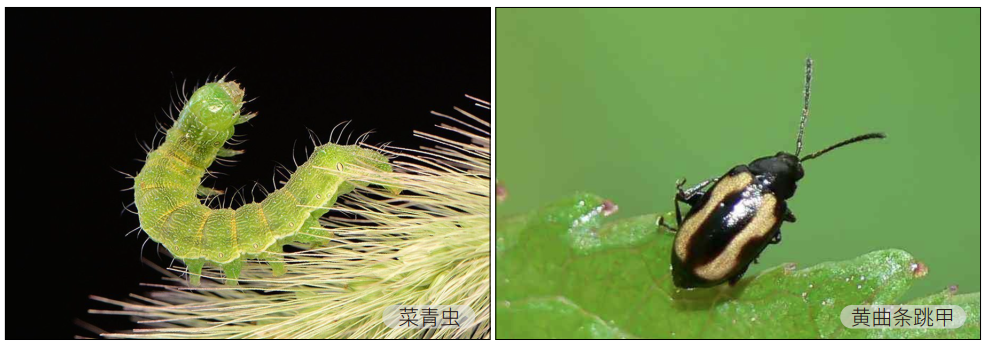 危害:菜青虫又叫青虫,成虫是菜白蝶。以幼虫为害叶片,吃成孔洞或缺刻,严重时全叶吃光,仅剩叶柄和叶脉。菜青虫一年发生 8-9 代,11 月开始以蛹越冬。3 月中旬第一代成虫开始发生。成虫白天活动吸食花蜜,喜欢在甘蓝、花椰菜上产卵。每头雌蛾可产卵100-200 粒,卵期 3-8 天。幼虫共五龄,三龄前食量较小,抗药性差。