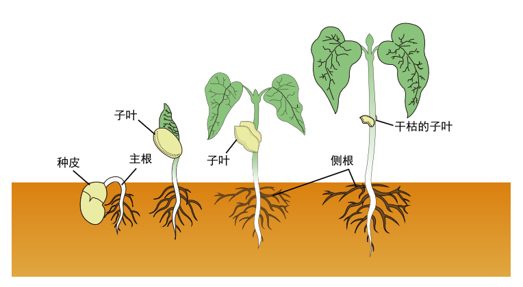 双子叶植物种子有两片子叶,贮藏有丰富的营养物质,即使在黑暗条件下,它也能够通过自身的营养物质来供能,生长出根和叶。